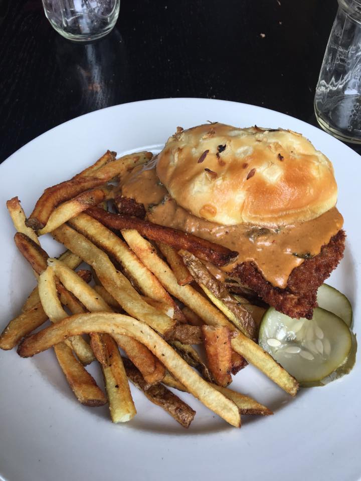 Ordered: cinnamon roll, reuben, lemon-ricotta pancakes, chicken’n’biscuit, grilled chicken pesto pasta. Food: 6.5/10 as a whole. Each meal had a component we enjoyed, but it wasn’t amazing. We appreciate the farm to table aspect, but we’ve been to farm to table restaurants where the quality of food stands it. The home made fries were great! The side of potatoes is just the fries cut into pieces. The ketchup has a salsa consistency. Not bad— not for everyone. The chilli oil tasted like chalula. The whipped lemon ricotta was light and I would order it again. The icing on the cinnamon amazing. I’m not a fan of traditional frosting abs prefer a cream cheese base. The icing was top tier. The pastry was average. Service: it was your average service. No complaints. She did her job Atmosphere: Cute. Very cute. Lots of natural sunlight. Furniture gives an at home vibe. The women’s bathroom has 2 stalls and one sink that doesn’t have depth.